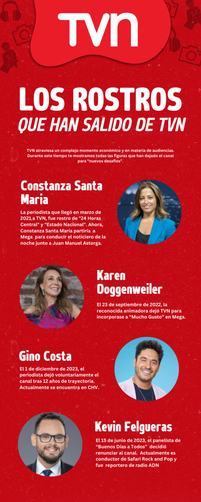 La ex conductora de 24 Horas Central y Estado Nacional Constanza Santa María, acaba de dejar TVN para incorporarse a la conducción del noticiario central de Mega Noticias. Con esta salida, TVN acumula una larga lista de rostros televisivos que han salido y se suma su pérdida económica y rating.