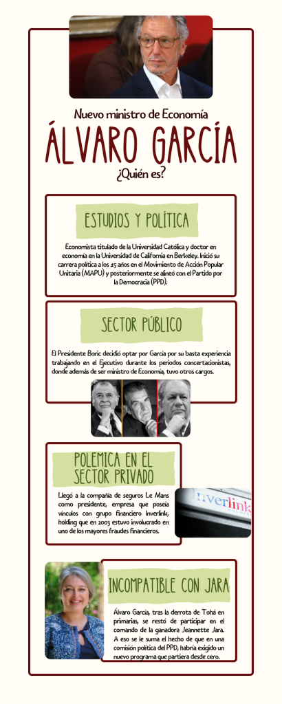 El Presidente Boric decidió optar por García por su basta experiencia trabajando en el Ejecutivo durante los tres periodos concertacionistas, donde además de ser ministro de Economía, tuvo otros cargos.
