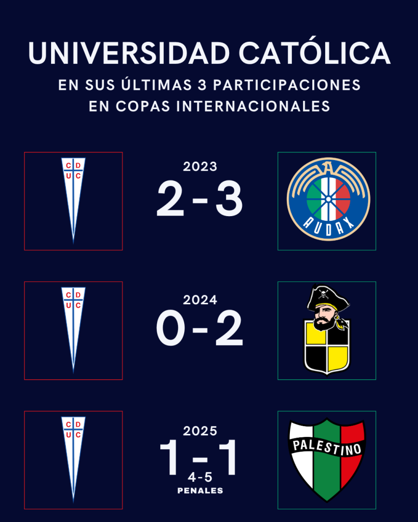 Dicho esto, la última vez que Universidad Católica jugó un encuentro a nivel internacional, fue el 7 de julio de 2022 frente a São Paulo por la vuelta de los octavos de final de la Copa Sudamericana, partido que finalizó en goleada por 4-1 a favor del conjunto brasileño y que terminó en un aplastante global de 8-3.