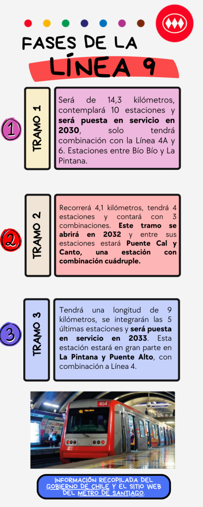 En 2030 abrirá la Línea 9 del Metro que conectará a La Pintana y Puente Alto con las comunas de Santiago y Recoleta en solo 35 minutos, según el sitio web del Metro. Este tramo tiene como principal propósito generar más conectividad con los sectores con menos cobertura de la red, como Bajos de Mena, La Legua y La Pintana. Además, contará con 6 combinaciones y una de sus estaciones, la estación Cal y Canto, tendrá una combinación cuádruple con las Líneas 2, 7 y 3.