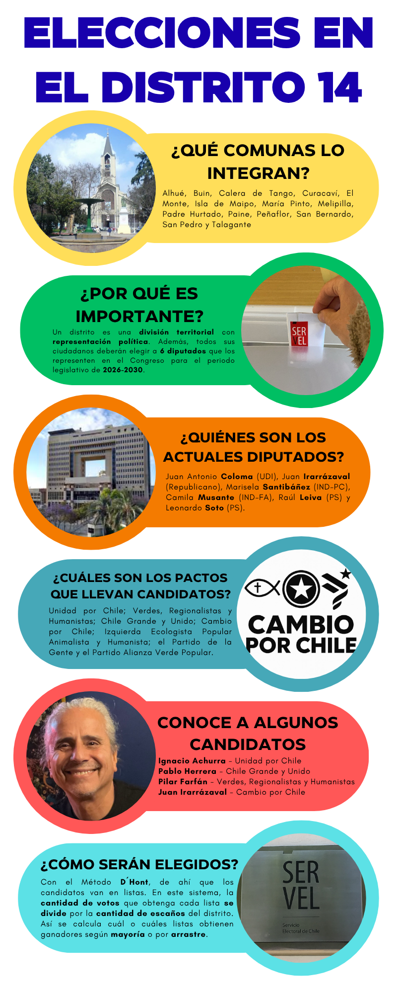 En ese sentido, el distrito 14 de la Región Metropolitana, es uno de los más solicitados, tanto por incumbentes, como por rostros nuevos, que buscan representar a las comunas de Alhué, Buin, Calera de Tango, Curacaví, El Monte, Isla de Maipo, María Pinto, Melipilla, Padre Hurtado, Paine, Peñaflor, San Bernardo, San Pedro y Talagante.