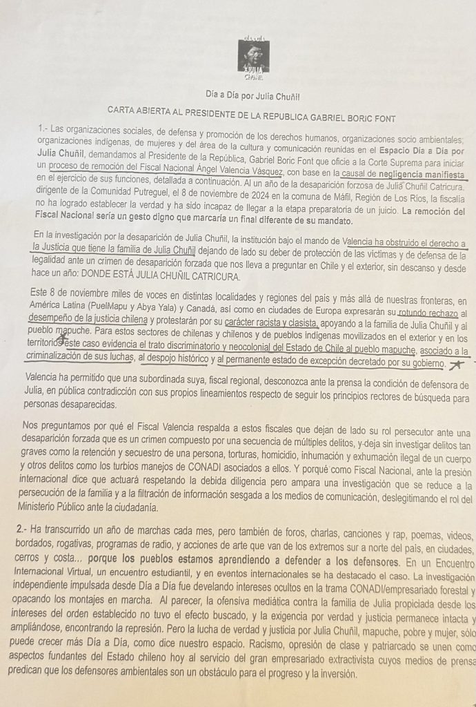 Como parte de los actos conmemorativos de el año de desaparición de Julia Chuñil, hoy en Morandé 80, Comuna de Santiago, diversas mujeres pertenecientes a el colectivo “Día a Día por Julia Chuñil” se reunieron a presentar una Carta Abierta al Presidente Gabriel Boric, donde le exigen la destitución de Ángel Valencia, Fiscal Nacional.