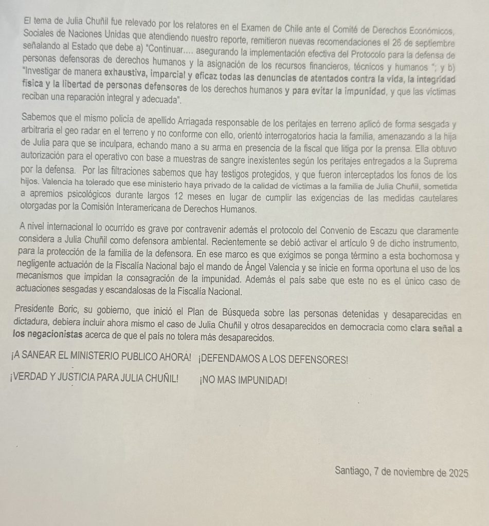 Además, el documento de dos páginas acusa a Valencia, quién es titular del Ministerio Público desde 2023, de obstrucción al derecho a la justicia de la familia Chuñil, negligencia manifiesta , respaldo a fiscales que dejan de lado su rol persecutor ante una desaparición forzada, persecución familiar y filtración de información sesgada a los medios de comunicación, entre otros