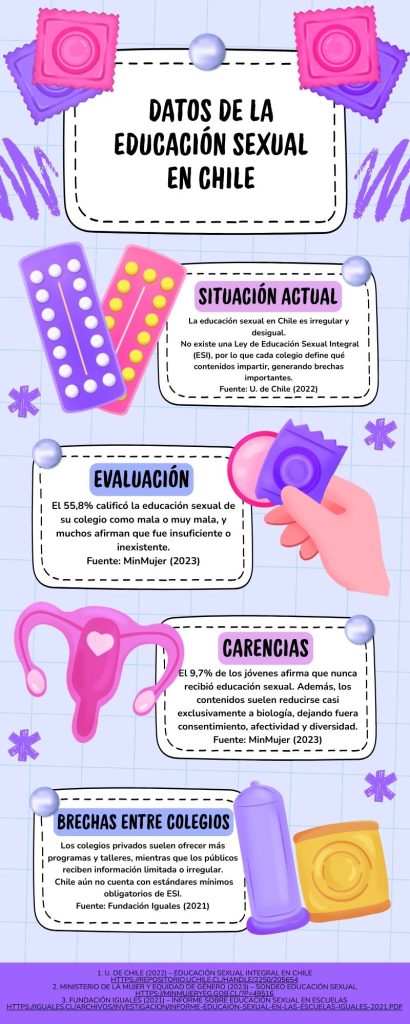 Según el Ministerio de la Mujer y Equidad de Género, el 55,8% de los jóvenes chilenos evaluó de forma negativa la educación sexual recibida en su colegio, calificándola como “mala” o “muy mala”, e incluso señalando que nunca recibieron algún tipo de enseñanza.
