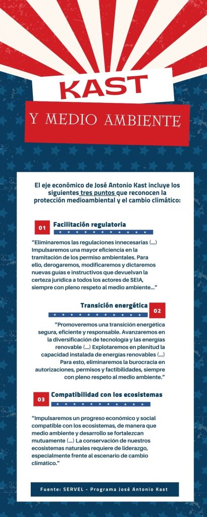 A pesar de lo anterior, el programa de José Antonio Kast menciona la protección medioambiental en algunos puntos de su programa. Específicamente, el documento programático del candidato del Partido Republicano señala que, en un eventual gobierno, promoverán una facilitación regulatoria “siempre con pleno respeto al medio ambiente”.